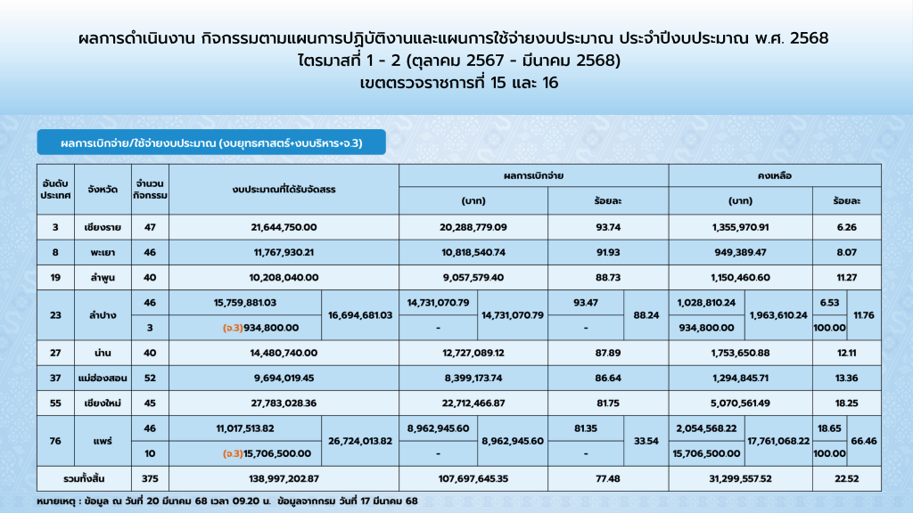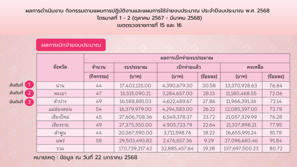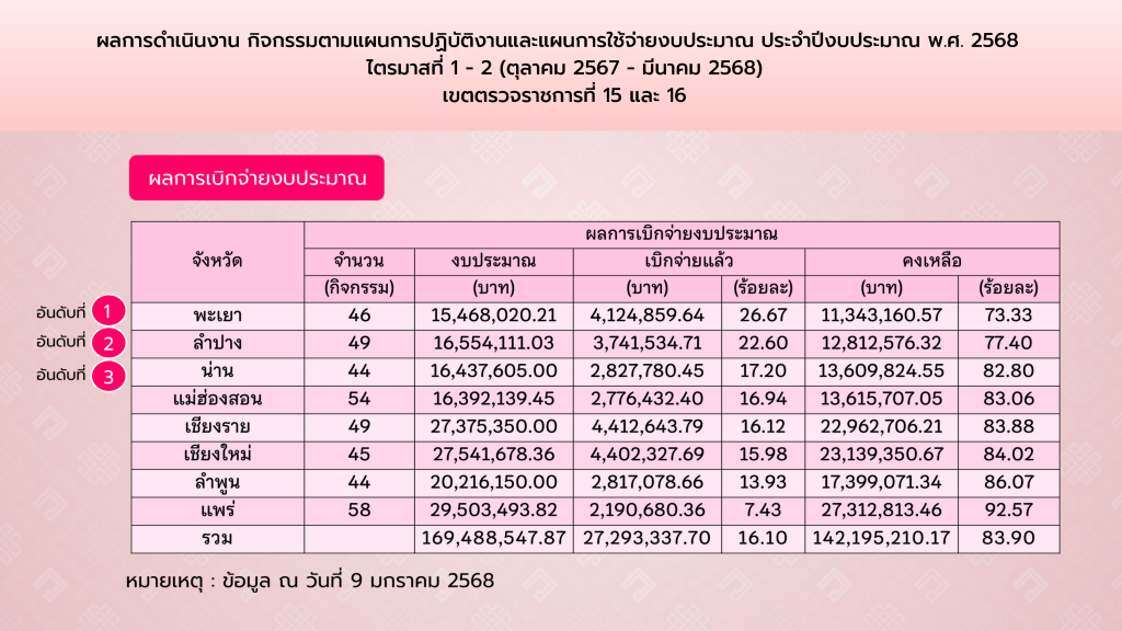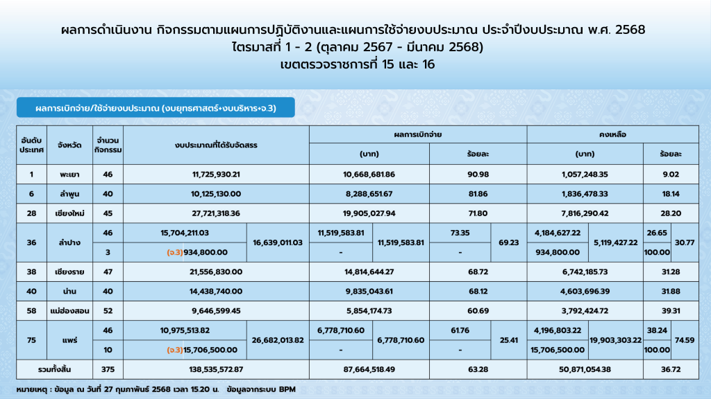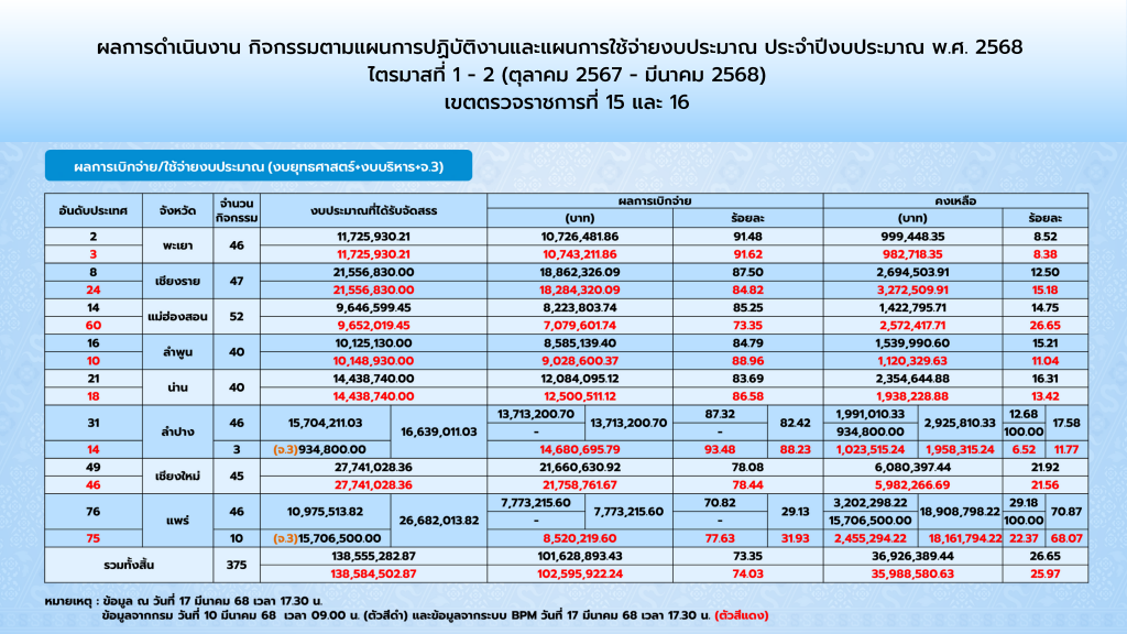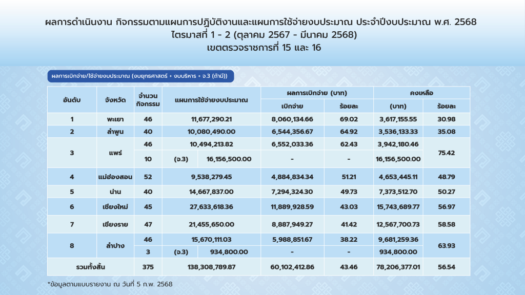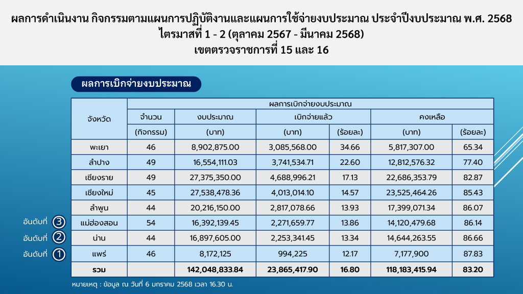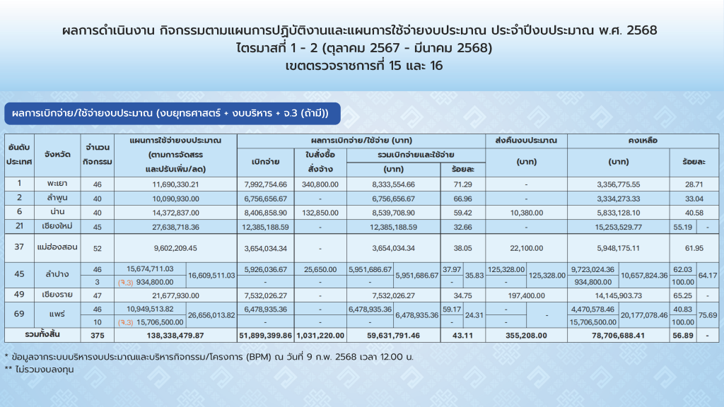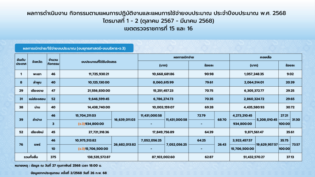 ผลการเบิกจ่ายงบประมาณ เขตตรวจราชการที่ 15 และ 16