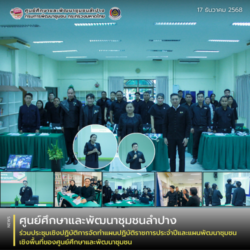 นางศุภลักษณ์ แก้วมณี ผู้ตรวจราชการกรม ปฏิบัติหน้าที่ผู้อำนวยการศูนย์ศึกษาและพัฒนาชุมชนลำปาง มอบหมายให้นายเกรียงไกร สิงห์แก้ว ผู้อำนวยการกลุ่มงานวิจัยและพัฒนาชุมชนเชิงพื้นที่ และบุคลากรในสังกัดศูนย์ศึกษาและพัฒนาชุมชนลำปาง เข้าร่วมการฝึกอบรมโครงการบริหารการขับเคลื่อนแผนปฏิบัติราชการของกรมการพัฒนาชุมชน กิจกรรมที่ 2 การประชุมเชิงปฏิบัติการจัดทำแผนปฏิบัติราชการประจำปีและแผนพัฒนาชุมชนเชิงพื้นที่ของศูนย์ศึกษาและพัฒนาชุมชน ระหว่างวันที่ 17-19 ธันวาคม 2568 ณ ศูนย์ศึกษาและพัฒนาชุมชนนครนายก