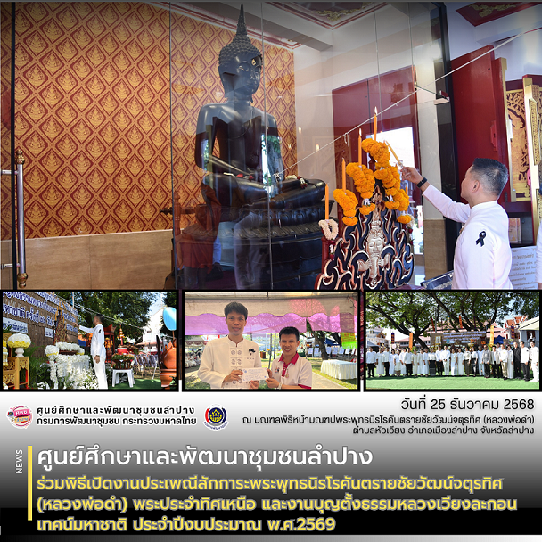 นายวิวัฒน์ อินทร์ไทยวงศ์ ผู้ว่าราชการจังหวัดลำปาง เป็นประธานในพิธีเปิดงานประเพณีสักการะพระพุทธนิรโรคันตรายชัยวัฒน์จตุรทิศ (หลวงพ่อดำ) พระประจำทิศเหนือ และงานบุญตั้งธรรมหลวงเวียงละกอน เทศน์มหาชาติ ประจำปีงบประมาณ พ.ศ.2569 โดยมี นายปุณณสิน มณีนันทน์ นายกเทศมนตรีนครลำปาง นางเบ็ญจมาส บุญเทพ วัฒนธรรมจังหวัดลำปาง ศาสตราจารยเกียรติคุณสยมพร ศิรินาวิน คณะผู้บริหารจากหน่วยงานองค์กรภาครัฐ รัฐวิสาหกิจ ภาคเอกชน องค์กรปกครองส่วนท้องถิ่น นักเรียน นักศึกษา รวมถึงพุทธศาสนิกชนชาวลำปาง ร่วมพิธีเปิดงานฯ ณ มณฑลพิธีหน้ามณฑปพระพุทธนิรโรคันตรายชัยวัฒน์จตุรทิศ (หลวงพ่อดำ) ตำบลหัวเวียง อำเภอเมืองลำปาง จังหวัดลำปาง