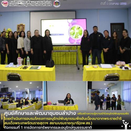 นางศุภลักษณ์ แก้วมณี ผู้ตรวจราชการกรม ปฏิบัติหน้าที่ผู้อำนวยการศูนย์ศึกษาและพัฒนาชุมชนลำปาง มอบหมายให้ผู้อำนวยการกลุ่มงานตรวจราชการ ปฏิบัติหน้าที่แทนผู้ตรวจฯ นางจุฬาลักษณ์ เอ่งฉ้วน พร้อมด้วยผู้อำนวยการกลุ่มงาน และเจ้าหน้าที่ศูนย์ศึกษาและพัฒนาชุมชนลำปาง ดำเนินการอบรมโครงการอนุรักษ์พันธุกรรมพืชอันเนื่องมาจากพระราชดำริ สมเด็จพระเทพรัตนราชสุดาฯ สยามบรมราชกุมารี(อพ.สธ.) กิจกรรมที่ 1 การจัดการทรัพยากรและอนุรักษ์ทุนธรรมชาติ โดยมีวัตถุประสงค์เพื่อค้นหาพืชพื้นถิ่นที่มีหลากหลายสายพันธุ์ และจัดพื้นที่ปลูกให้เป็นแหล่งเรียนรู้ของสายพันธุ์ของพืชชนิดนั้น ในพื้นที่สนองพระราชดำริโครงการ อพ.สธ. กลุ่มเป้าหมาย ประกอบด้วย เจ้าหน้าที่ ศพช.ลำปาง จำนวน 12 คน โดยได้รับเกียรติจากรองศาสตราจารย์ ดร.มาลี ตั้งระเบียบ ผู้สนับสนุนมูลนิธิ อพ.สธ. และทีมงานจากมหาวิทยาลัยเทคโนโลยีราชมงคลล้านนา เป็นวิทยากรบรรยายให้ความรู้