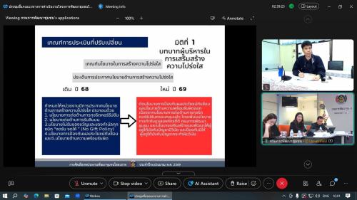 2. อธิบายเกณฑ์การประเมินและระบบรายงานผลการดำเนินงานโครงการพัฒนาชุมชนใสสะอาด ประจำปีงบประมาณ พ.ศ. 2569 โดยนางสาวสุภารี บุญนฤธี ผู้อำนวยการกลุ่มงานวินัยและพิทักษ์ระบบคุณธรรม