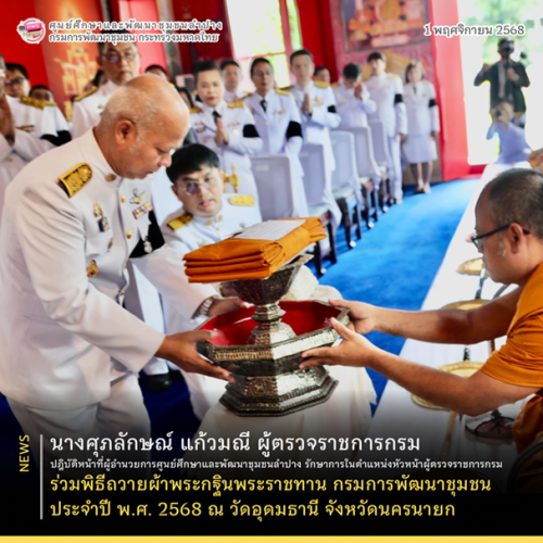 ในการนี้ นางศุภลักษณ์ แก้วมณี ผู้ตรวจราชการกรม ปฎิบัติหน้าที่ผู้อำนวยการศูนย์ศึกษาและพัฒนาชุมชนลำปาง รักษาการในตำแหน่งหัวหน้าผู้ตรวจราชการกรม ร่วมพิธีถวายผ้าพระกฐินพระราชทาน กรมการพัฒนาชุมชน ประจำปี พ.ศ. 2568 ณ วัดอุดมธานี จังหวัดนครนายก ในครั้งนี้ด้วย