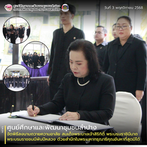 ทั้งนี้ ศูนย์ศึกษาและพัฒนาชุมชนลำปางได้จัดสถานที่สำหรับลงนามถวายความอาลัย สมเด็จพระนางเจ้าสิริกิติ์ พระบรมราชินีนาถ พระบรมราชชนนีพันปีหลวง ไว้บริเวณโถงอาคารอำนวยการ เพื่อเปิดโอกาสให้ข้าราชการ พนักงานราชการ เจ้าหน้าที่ และประชาชนผู้ที่ประสงค์จะร่วมถวายความอาลัย ได้เดินทางมาลงนามแสดงความสำนึกในพระมหากรุณาธิคุณและน้อมรำลึกถึงพระองค์ท่านได้อย่างต่อเนื่อง
