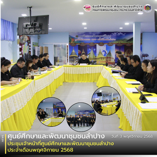 นางศุภลักษณ์ แก้วมณี ผู้ตรวจราชการกรม ปฏิบัติหน้าที่ผู้อำนวยการศูนย์ศึกษาและพัฒนาชุมชนลำปาง เป็นประธานการประชุมเจ้าหน้าที่ศูนย์ศึกษาและพัฒนาชุมชนลำปาง ประจำเดือนพฤศจิกายน 2568 โดยมีผู้อำนวยการกลุ่มงาน หัวหน้าฝ่าย และเจ้าหน้าที่ศูนย์ศึกษาและพัฒนาชุมชนลำปาง เข้าร่วมการประชุมฯ
