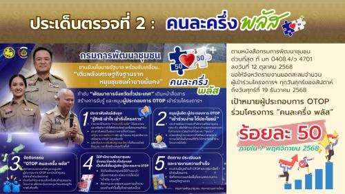 2. การส่งเสริมผู้ประกอบการ OTOP เข้าร่วมโครงการ “คนละครึ่ง พลัส” : ตามที่รัฐบาลได้จัดทำโครงการ คนละครึ่ง พลัส และมีนโยบายให้ส่งเสริมผู้ประกอบการ OTOP เข้าร่วมโครงการ นั้น จังหวัดเชียงใหม่มีผู้ประกอบการ OTOP เข้าร่วมโครงการแล้ว จำนวน 180 ราย จากทั้งหมด 2,049 ราย คิดเป็นร้อยละ 7.8 ให้สำนักงานพัฒนาชุมชนจังหวัด/อำเภอ เร่งรัดดำเนินการตามข้อสั่งการอธิบดีกรมการพัฒนาชุมชน ส่งเสริม ประชาสัมพันธ์ให้ผู้ประกอบการสมัครเข้าร่วมโครงการ ให้ได้ตามเป้าหมายร้อยละ 50 ภายในวันที่ 7 พฤศจิกายน 2568 และร้อยละ 70 ภายในวันที่ 27 พฤศจิกายน 2568