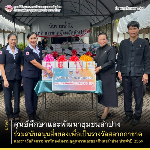 🔆 นางศุภลักษณ์ แก้วมณี ผู้ตรวจราชการกรม ปฏิบัติหน้าที่ผู้อำนวยการศูนย์ศึกษาและพัฒนาชุมชนลำปาง พร้อมด้วยนายชยพล แสนภิบาล หัวหน้าฝ่ายอำนวยการ และเจ้าหน้าที่ศูนย์ศึกษาและพัฒนาชุมชนลำปาง ร่วมกิจกรรมวันรวมน้ำใจเหล่ากาชาดจังหวัดลำปาง ประจำปี 2569 โดยสนับสนุนกระติกน้ำร้อน จำนวน 6 ใบ เพื่อเป็นรางวัลสลากกาชาดและรางวัลกิจกรรมนาทีทองในงานฤดูหนาวและของดีนครลำปาง ประจำปี 2569 ซึ่งกำหนดจัดงานระหว่างวันที่ 12 - 21 ธันวาคม 2568 ณ มหาวิทยาลัยการกีฬาแห่งชาติ วิทยาเขตลำปาง