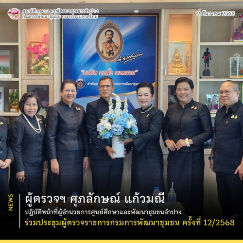 นางศุภลักษณ์ แก้วมณี ผู้ตรวจราชการกรม ปฏิบัติหน้าที่ผู้อำนวยการศูนย์ศึกษาและพัฒนาชุมชนลำปาง ร่วมการประชุมผู้ตรวจราชการกรม ครั้งที่ 12/2568 โดยมีนายสงัด พืชพันธุ์ หัวหน้าผู้ตรวจราชการกรม เป็นประธานฯ และคณะผู้ตรวจราชการกรมเข้าร่วมประชุมอย่างพร้อมเพรียง เพื่อร่วมกันติดตามประเด็นสำคัญด้านการปฏิบัติราชการ การกำกับติดตามนโยบาย และการขับเคลื่อนแผนงานของกรมการพัฒนาชุมชนในระดับพื้นที่