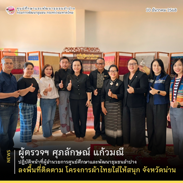 💫 นางศุภลักษณ์ แก้วมณี ผู้ตรวจราชการกรม ปฏิบัติหน้าที่ผู้อำนวยการศูนย์ศึกษาและพัฒนาชุมชนลำปาง พร้อมด้วยนางจุฬาลักษณ์ เอ่งฉ้วน ผู้อำนวยการกลุ่มงานตรวจราชการ และคณะฯ ลงพื้นที่ติดตามการขับเคลื่อนโครงการผ้าไทยใส่ให้สนุก กลุ่มผู้ผลิต ผู้ประกอบการหนึ่งตำบล หนึ่งผลิตภัณฑ์ (OTOP) ประเภทผ้า ของจังหวัดน่าน จำนวน 2 จุด ได้แก่ 1.กลุ่มผ้าซิ่นโบราณเมืองน่าน by คำไทด์ ม.7 ต.กองควาย อ.เมืองฯ และ 2.ร้านฝ้ายเงิน ม.7 ต.กองควาย อ.เมืองฯ