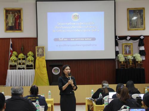 โดยในช่วงเช้า ได้รับเกียรติจาก นางสาวสุราพร ดวงเนตร ผู้อำนวยการกลุ่มงานจิตอาสาพระราชทานและกิจการพิเศษ ปฏิบัติหน้าที่ผู้อำนวยการกลุ่มงานสารบรรณกลางและอำนวยการ สำนักงานเลขานุการกรม กรมการพัฒนาชุมชน บรรยายในหัวข้อต่างๆ ที่เกี่ยวข้องกับงานสารบรรณ เช่น ระเบียบ พ.ร.บ. และความรู้ความเข้าใจในระบบ e-Office และในภาคบ่าย ทำกิจกรรมเวิร์กชอปใช้งานระบบ e-office ระบบเบื้องต้น สารบรรณส่วนกลาง/ภูมิภาค การร่าง ทาน ตรวจ และการใช้งานสำหรับผู้บริหาร