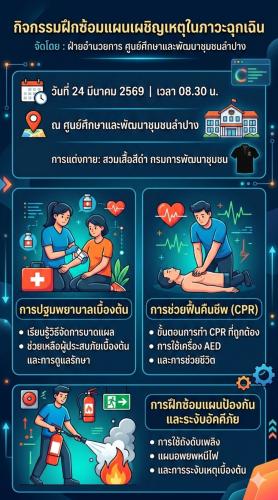 📝 นางศุภลักษณ์ แก้วมณี ผู้ตรวจราชการกรม ปฏิบัติหน้าที่ผู้อำนวยการศูนย์ศึกษาและพัฒนาชุมชนลำปาง พร้อมด้วยบุคลากรในสังกัด ดำเนินโครงการประชุมเชิงปฏิบัติการจัดทำแผนฝึกซ้อมแผนเผชิญเหตุในภาวะฉุกเฉิน เพื่อพัฒนาศักยภาพบุคลากรศูนย์ศึกษาและพัฒนาชุมชนลำปางให้มีความรู้ ความเข้าใจและยกระดับความพร้อมในการเผชิญเหตุในภาวะฉุกเฉินตามมาตรฐานการให้บริการ (Better Touch Point) กลุ่มเป้าหมาย ได้แก่ บุคลากรศูนย์ศึกษาและพัฒนาชุมชนลำปาง จำนวน 25 คน